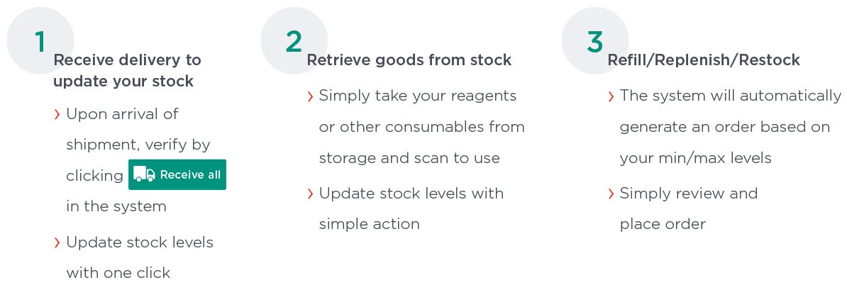 Let our inventory automation application sweat the details. The DxONE Inventory Manager software efficiently performs the essential, manual tasks of laboratory inventory management, leaving your skilled technologists with just three simple steps to keep your laboratory stocked and running efficiently.