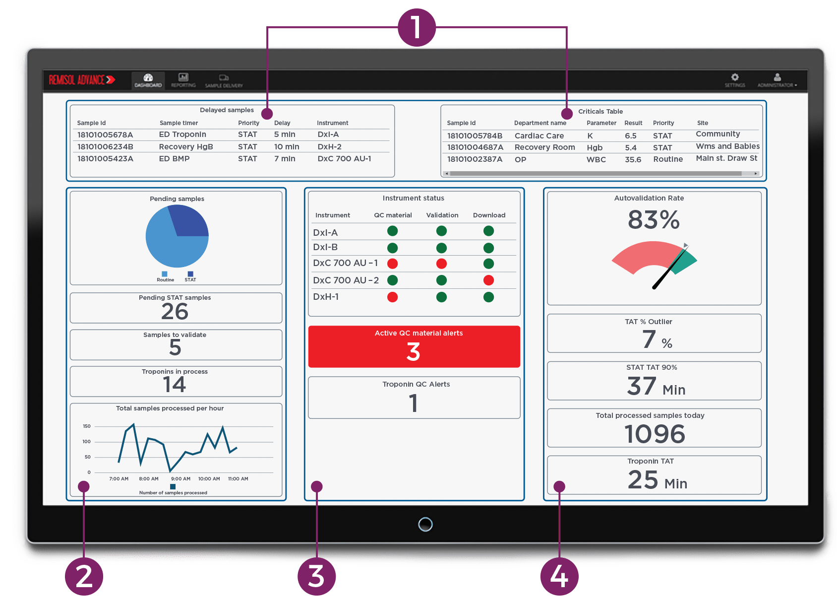 1. Sample managementFocus on critical and delayed samples to manage by exception 2. Sample workflowView summary of real-time sample status, giving a view into sample-processing stages 3. Quality controlMonitor QC performance by focusing on alerts 4. Performance criteriaTrack total lab performance, providing perspective into operations |