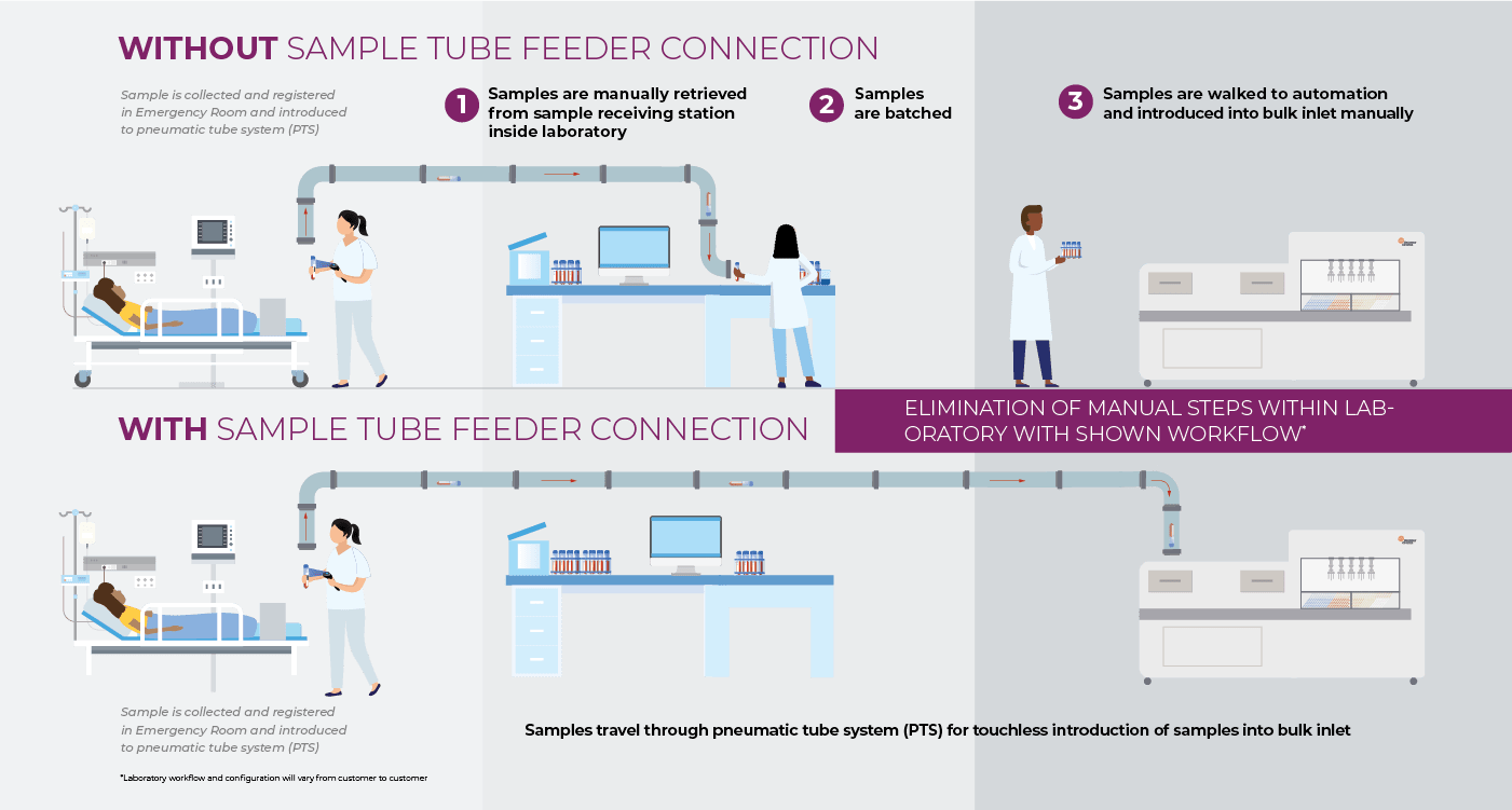 This feature can be suitable for various workflows in inpatient and outpatient settings. In situations where sample registration is not needed within the laboratory, samples can be introduced directly from tube transport systems into the bulk inlet through the Sample Tube Feeder connection, potentially allowing for touchless sample delivery from blood draw stations to the Power Express.
